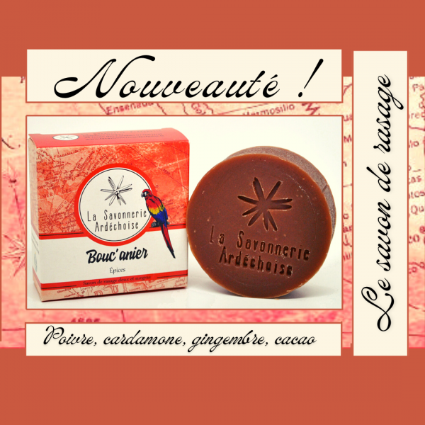 Ingrédients : Huile d’olive*, huile de coco*, huile de ricin, beurre de karité*, eau, soude, argile rouge, cacao, huiles essentielles de poivre noir*, cardamone*, gingembre* et cèdre*